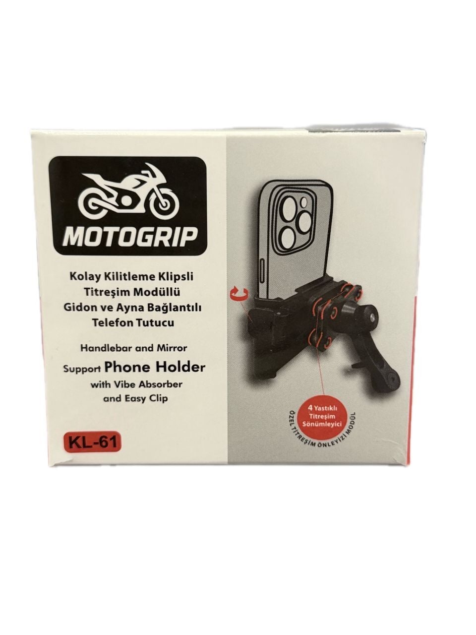 MOTOGRİP KL-61G Titreşim Önleyicili Motosiklet Telefon Tutucu 4 Yastıklı Titreşim Modülü ile Maksimum Güvenlik ve Konfor sunan motosiklet, atv, bisiklet ve scooter kullanıcılarının ihtiyaçlarına yönelik olarak geliştirilmiş, Bu özel sistem, sürüş sırasında oluşan sarsıntıları ve titreşimleri büyük ölçüde sönümleyerek telefonunuzun güvenliğini maksimum seviyeye çıkarır.